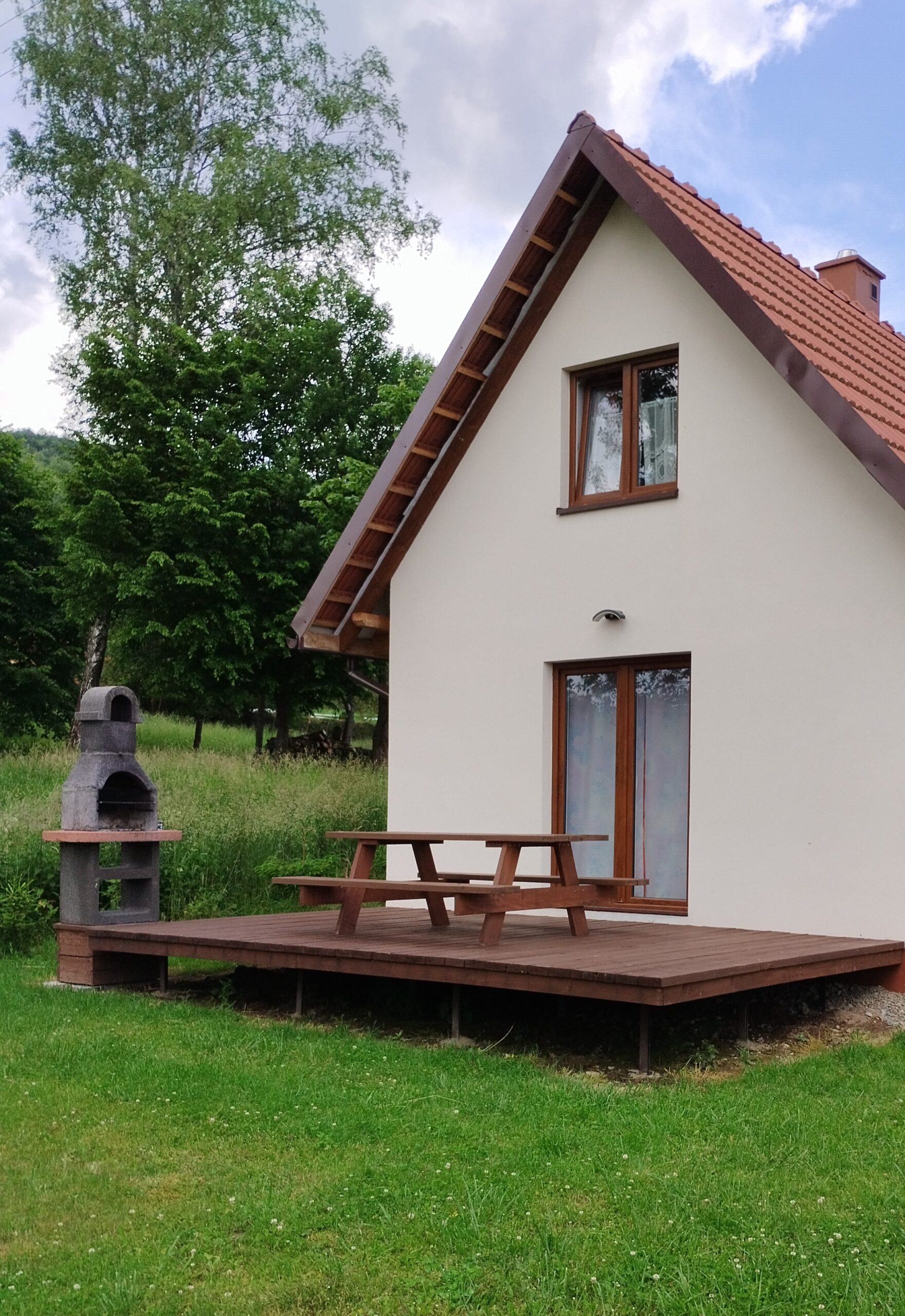Murowany domek z tarasem, przeznaczony dla 6 osób, położony w Brzegach Dolnych z widokiem na okoliczne góry – Lawortę i Orlik.